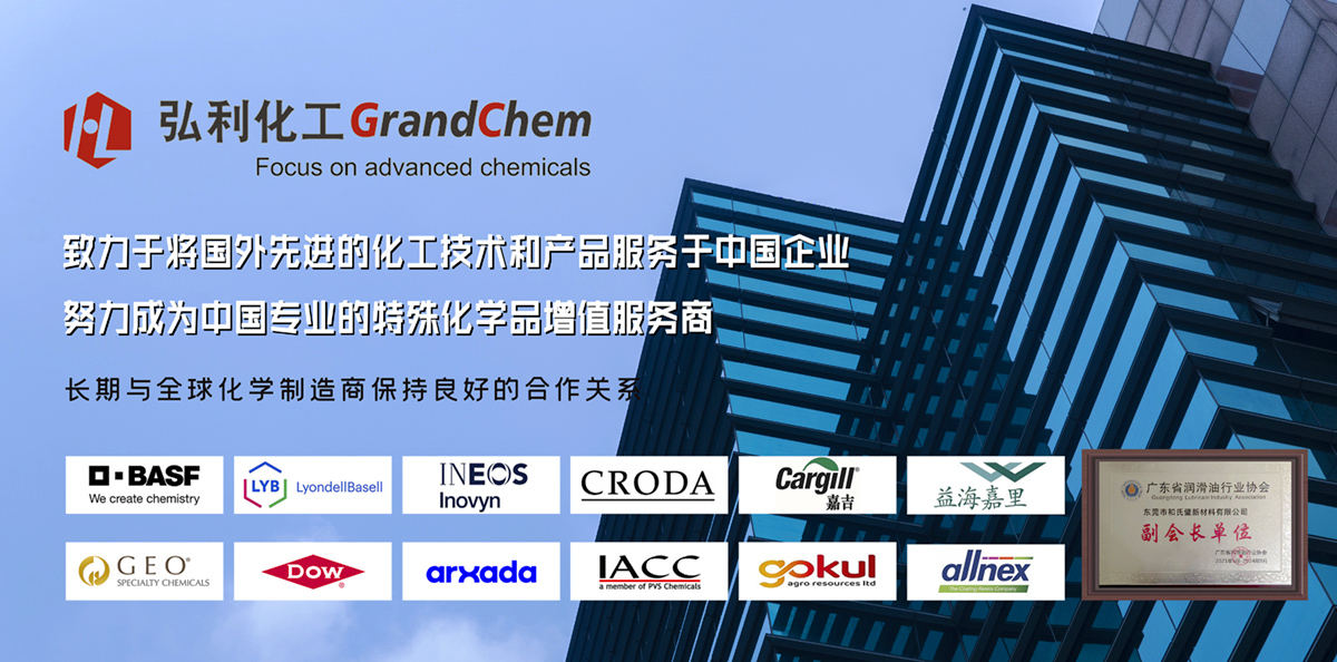 弘利化工Grandchem专注于高性能化学品的增值服务,公司凝聚着一批热爱化学并善于琢磨技术和市场的年轻人,长期与世界领先的化学制造商保持着良好的合作伙伴关系,包括巴斯夫BASF,利安德巴赛尔Lyondellbasell、禾大CRODA,英力士INOVYN,美国GEO,泰国IACC,陶氏化学DOW,奥沙达Arxada,湛新树脂Allnex,索尔维Solvay等杰出公司,连续多年获得BASF中国最佳经销商奖,是广东省润滑油协会副会长单位,致力于将国内外先进的化工技术和产品服务于中国企业,努力成为中国专业的特殊化学品增值服务商......
