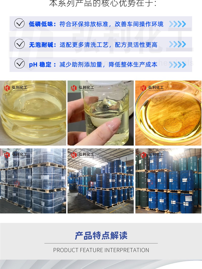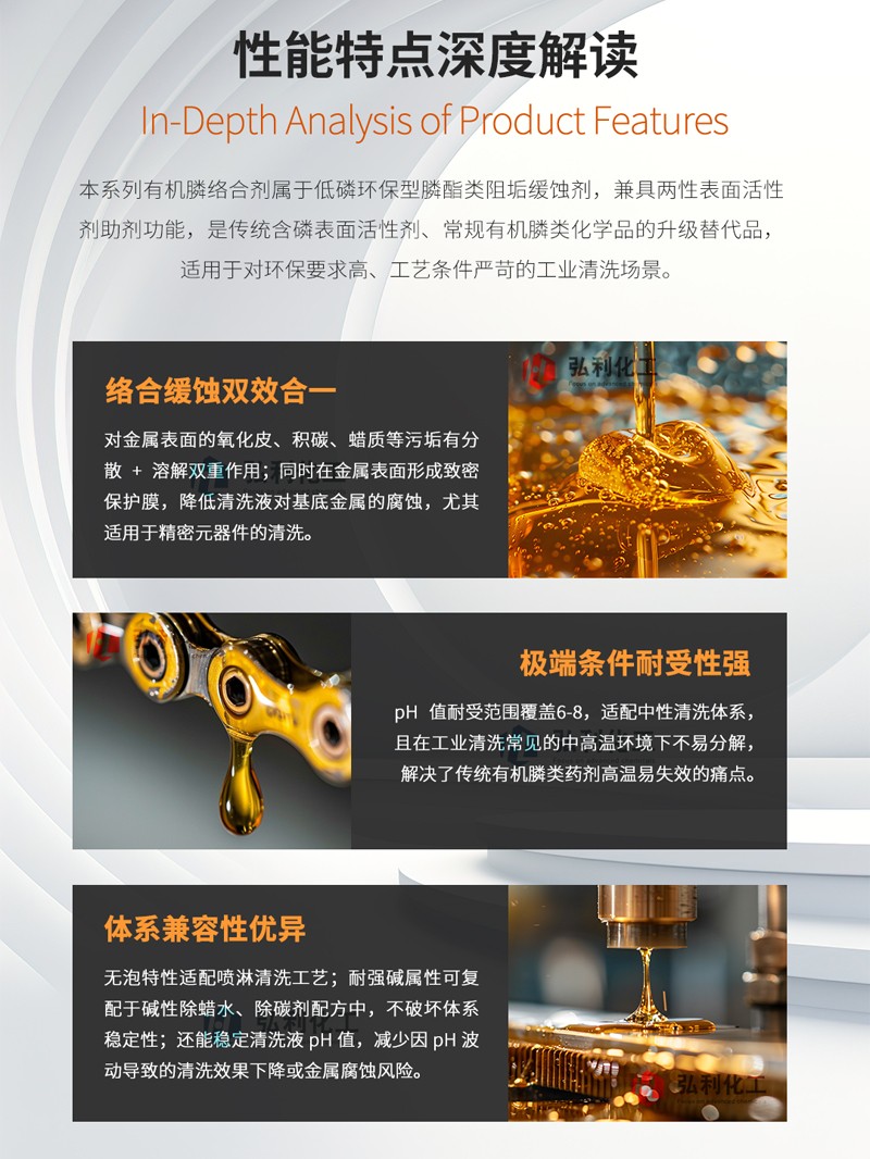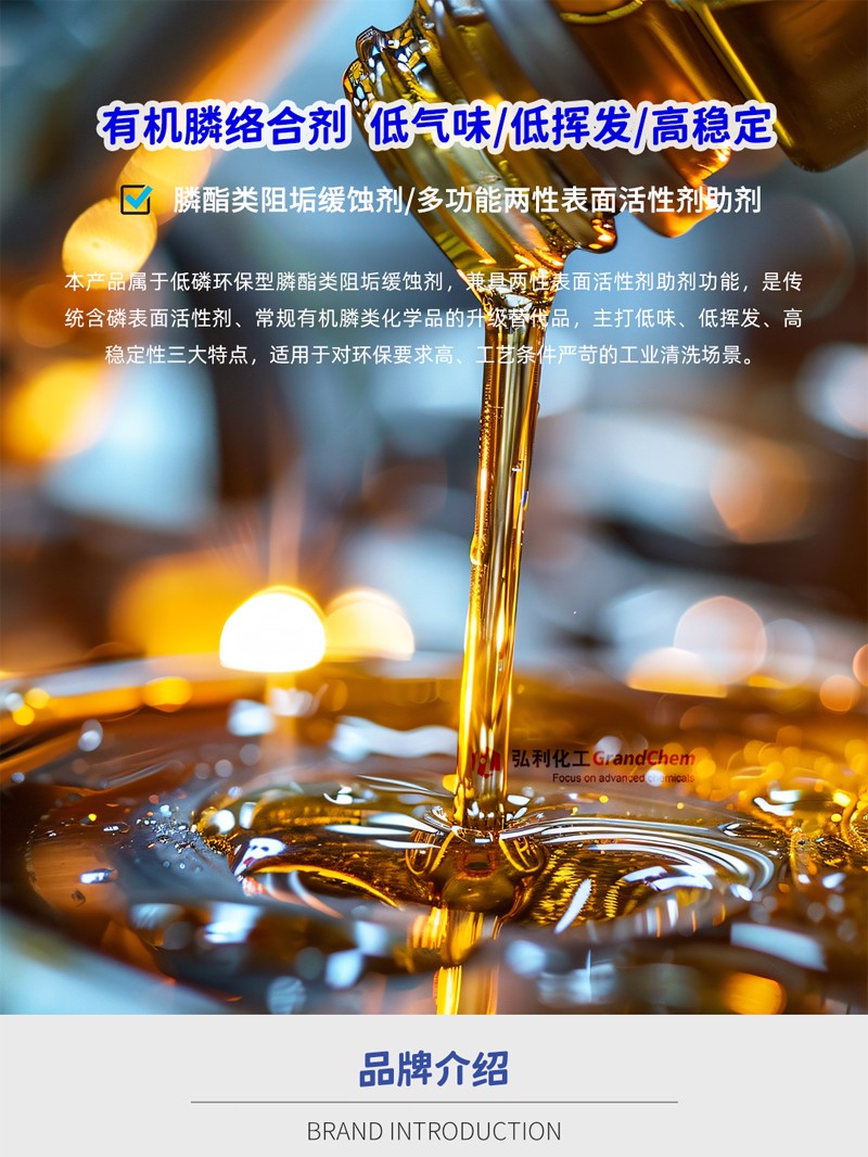 产品简介:有机膦络合剂属膦酯类阻垢缓蚀剂,多功能两性表面活性剂助剂,能分散及溶解金属表面氧化皮双重作用,对金属表面缓蚀效果优异,是一种低味、低挥发的、有机膦化合物。它有良好的缓蚀作用,pH耐受性好,温度耐受性强且不易分解。有机膦络合剂具有络合、清灰、清碳、除氧化皮、PH稳定、无泡、耐强碱、除垢等作用。本产品是常规含磷表活或其他常规有机膦类化学原料的替代品,具有低磷、低味,有稳定产品PH值的作用。用于精密元器件清洗剂、喷淋清洗剂、除蜡水、除碳等。