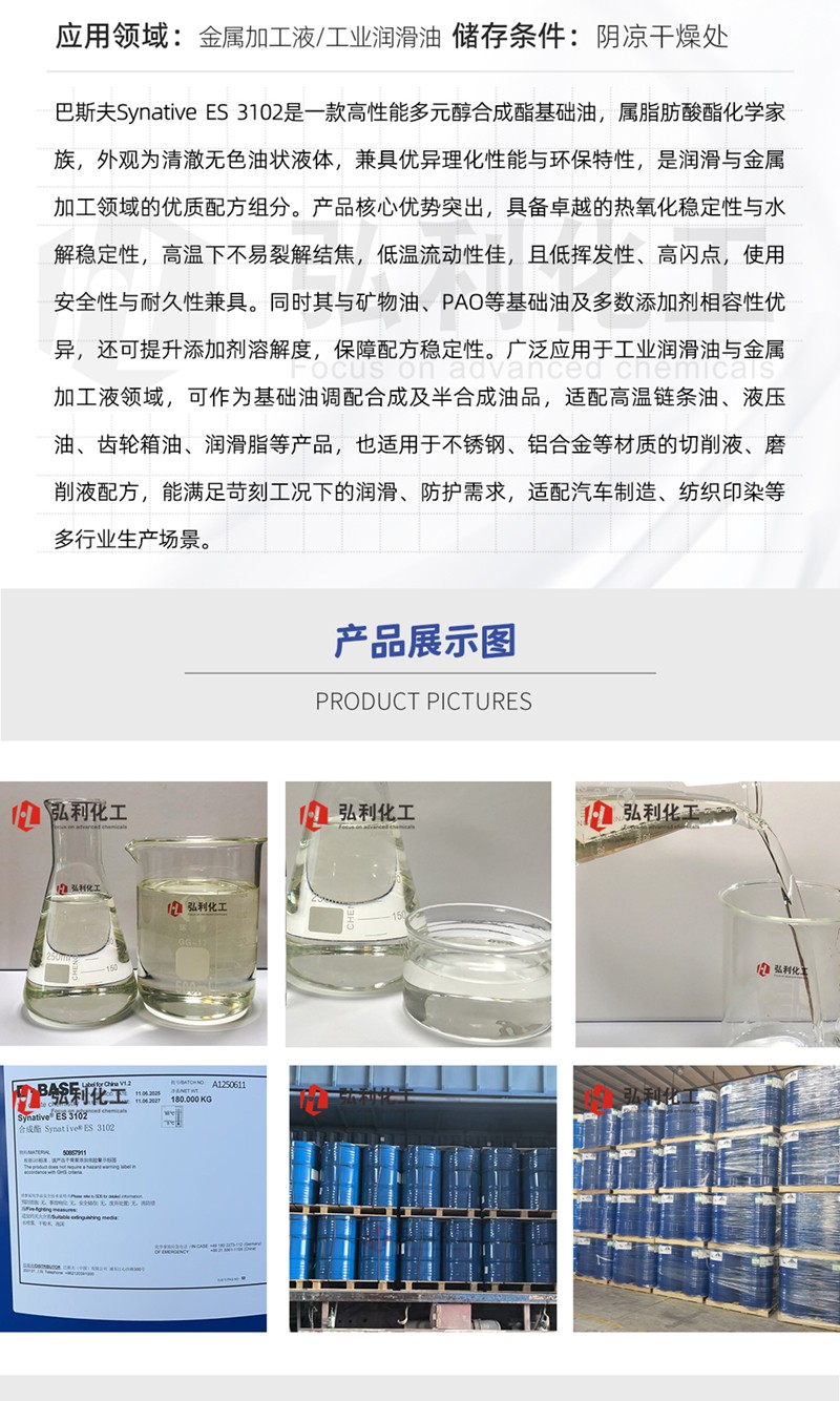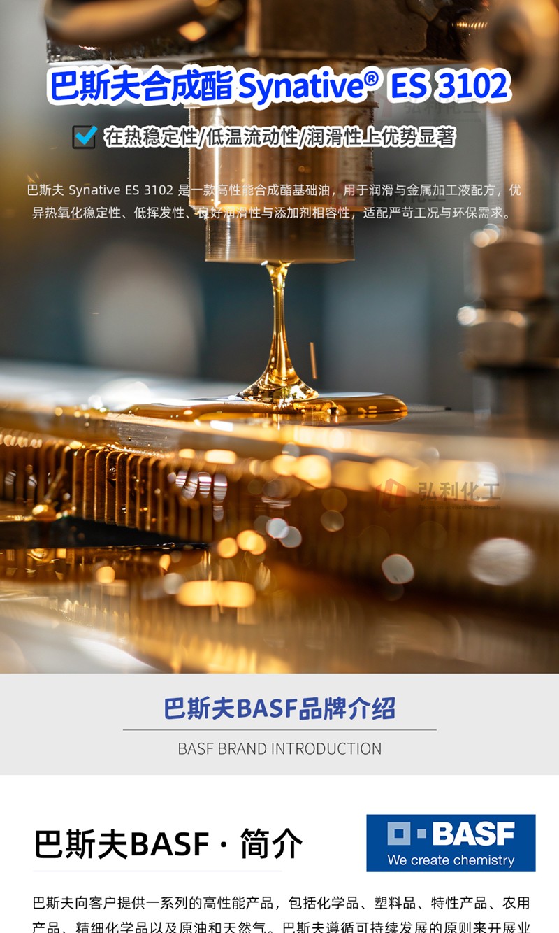 产品简介:巴斯夫Synative® ES 3102是一款高性能多元醇合成酯基础油,属脂肪酸酯化学家族,外观为清澈无色油状液体,兼具优异理化性能与环保特性,是润滑与金属加工领域的优质配方组分。产品核心优势突出,具备卓越的热氧化稳定性与水解稳定性,高温下不易裂解结焦,低温流动性佳,且低挥发性、高闪点,使用安全性与耐久性兼具。同时其与矿物油、PAO等基础油及多数添加剂相容性优异,还可提升添加剂溶解度,保障配方稳定性。广泛应用于工业润滑油与金属加工液领域,可作为基础油调配合成及半合成油品,适配高温链条油、液压油、齿轮箱油、润滑脂等产品,也适用于不锈钢、铝合金等材质的切削液、磨削液配方,能满足苛刻工况下的润滑、防护需求,适配汽车制造、纺织印染等多行业生产场景。