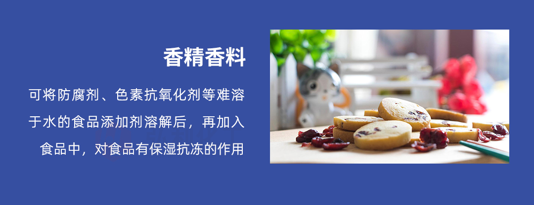 2. 食品、饮料:丙二醇为水溶剂,可以溶解水溶性香料、色素、防腐剂、维生素、树脂等。主要用作食品乳化剂,更是调味品和色素的优良溶剂,在糕点中作为稳定剂、凝固剂、抗解剂等使用,也可作为胶基糖果的软化剂和乳化剂。(用作食品乳化剂,更是调味品和色素的优良溶剂)